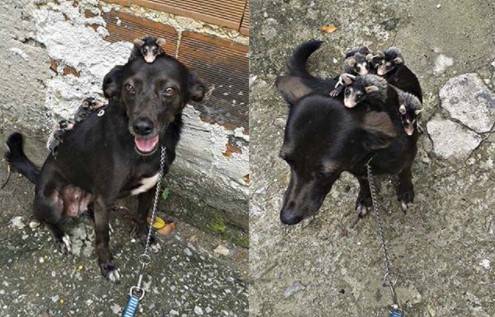 Embora Pretinha seja castrada e não produza leite, ela dá-lhes o abrigo de que os bichinhos precisam nesta fase. Os filhotes escalam como fariam com a mãe e Pretinha parece gostar também.