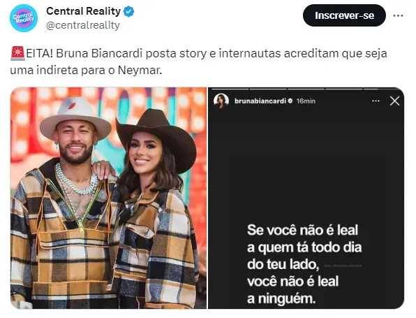 A mensagem dizia: "Se você não é leal a quem tá todo dia do teu lado, você não é leal a ninguém". No entanto, após os internautas associarem a mensagem ao namorado, Bruna apagou a publicação. Recentemente, o nome de Bruna esteve nas manchetes devido a alegações de traições de Neymar.